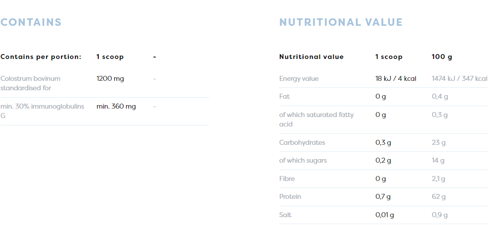 - Contains Colostrum bovinum standardised for immunoglobulins G min. 30% of dry mass.